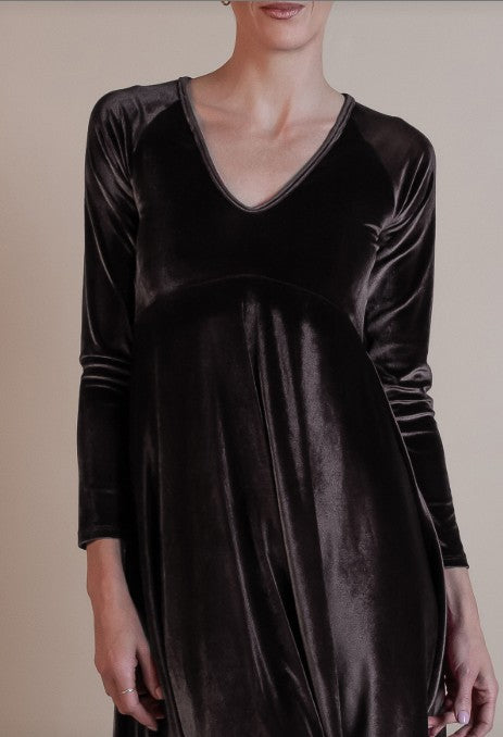 Everyone needs an easy holiday dress, simple yet fun in shape in a shiny and comfortable fabric. This scooped V neck dress hugs the upper waist while flaring into a fun flounced skirt.
